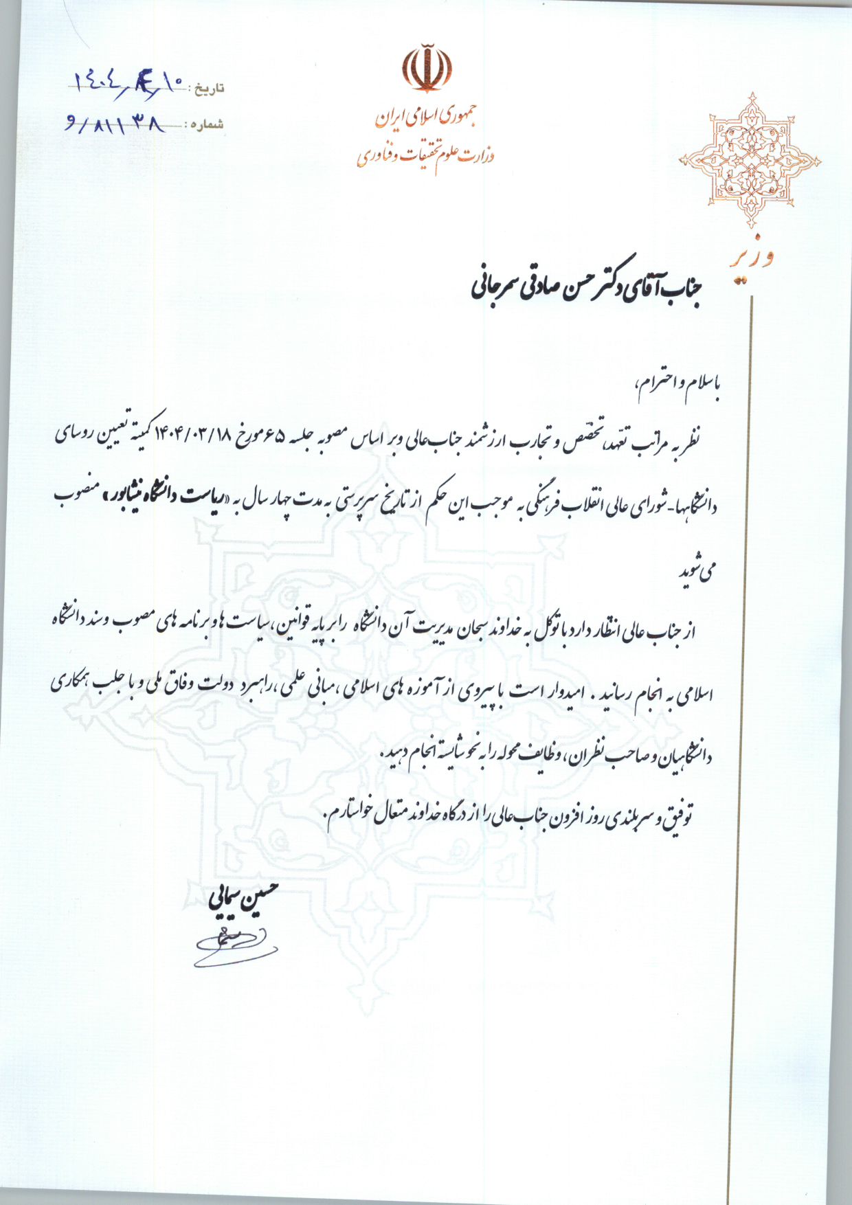 وزیر محترم علوم، تحقیقات و فناوری با صدور حکمی آقای دکتر حسن صادقی سمرجانی را به عنوان رئیس دانشگاه نیشابور منصوب کرد.
