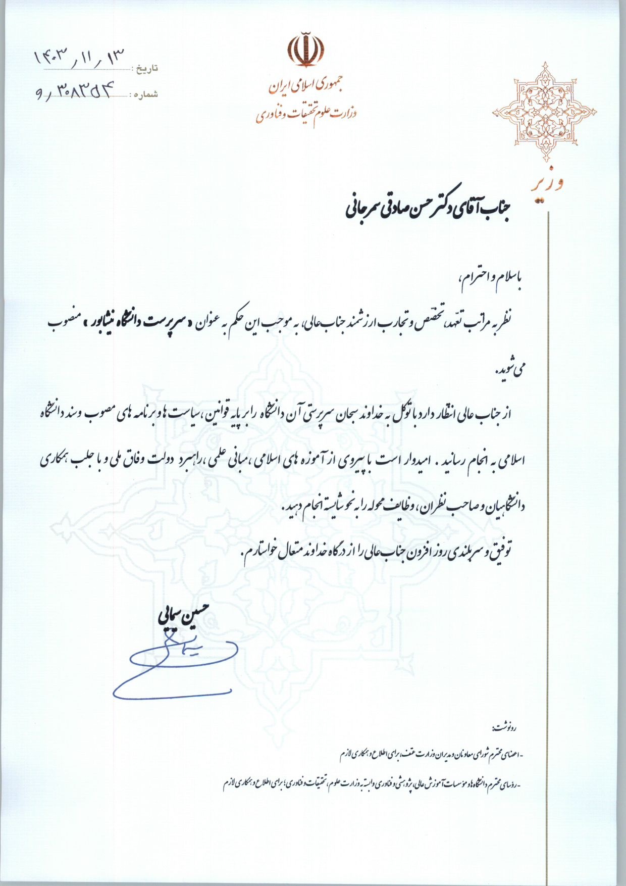 در حکم دکتر حسین سیمایی صراف، وزیر محترم علوم، خطاب به سرپرست دانشگاه نیشابور آمده است: