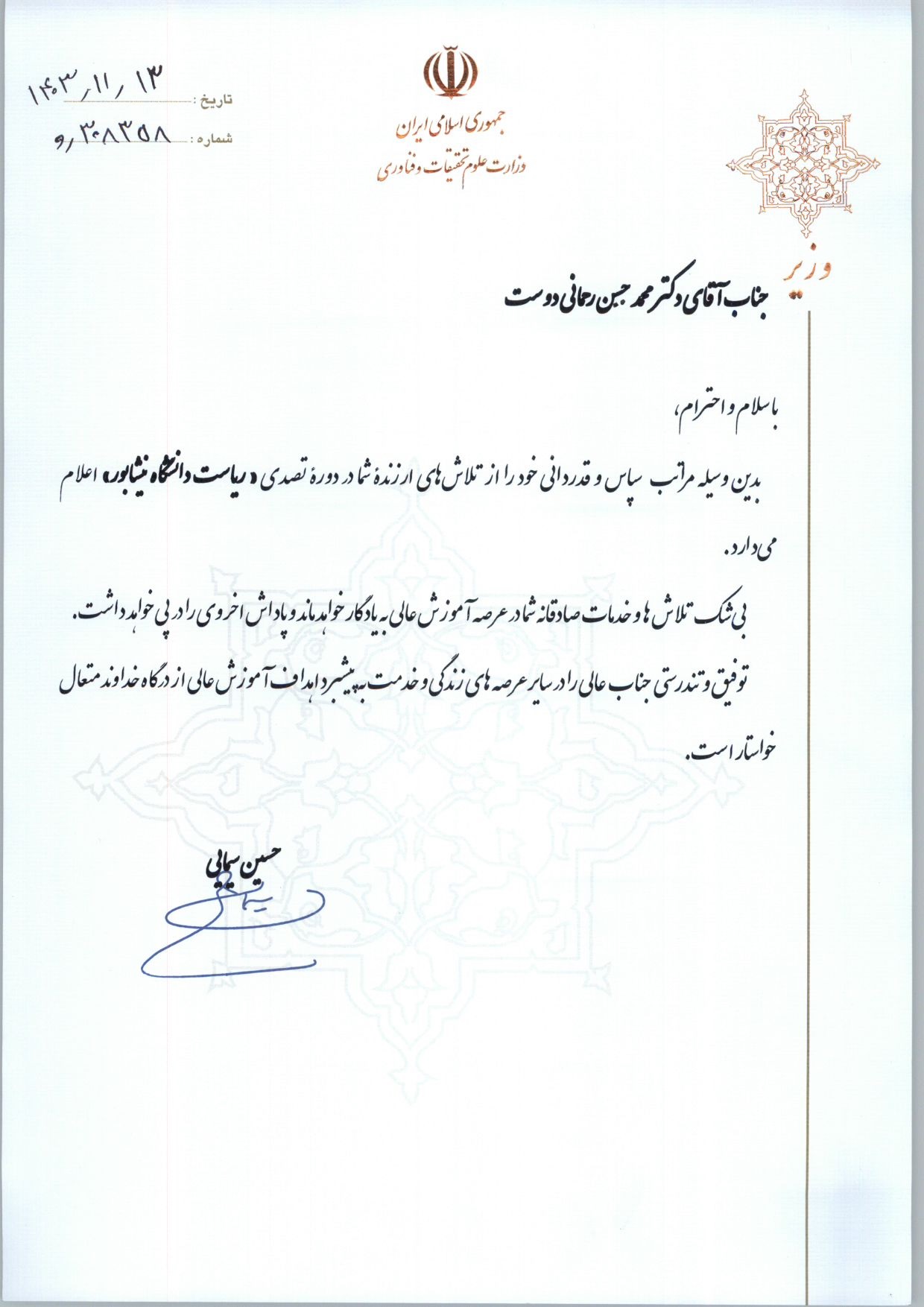 وزیر علوم در نامه جداگانهای از تلاش های دکتر محمد حسین رحمانی دوست، رئیس سابق دانشگاه نیشابور در زمان تصدی مسئولیت این دانشگاه نیز، قدردانی کرد.